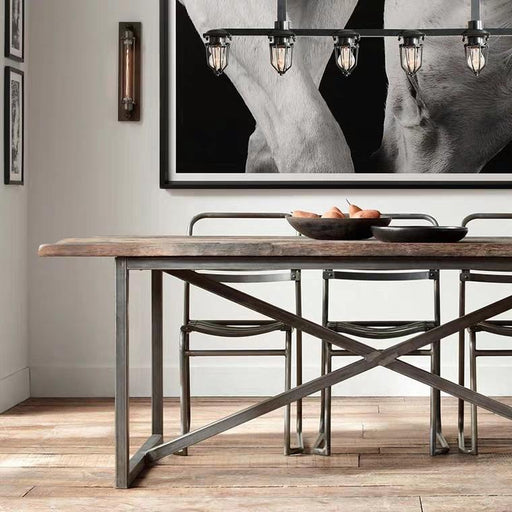 A distinctive brushed silver steel framework with crossbeams supports a reclaimed pine wood surface, Paisely add a rugged and distressed look to th...